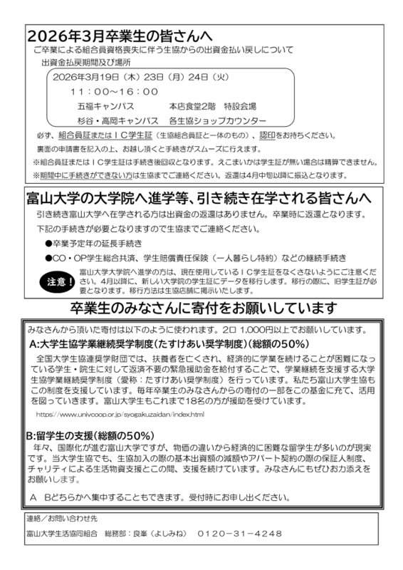 2026年3月卒業生の皆さんへ~出資金返還に関するお知らせ~ (2026年3月18日) 今年の出資金返還会場は終了いたしました。お手続をご希望される方は、生協までお問合せください。 関連情報 URL: 地域生協(コープ)の宅配サービス 関連ファイル 出資金返還案内(PDF)出資金返還申請書(PDF) 戻る