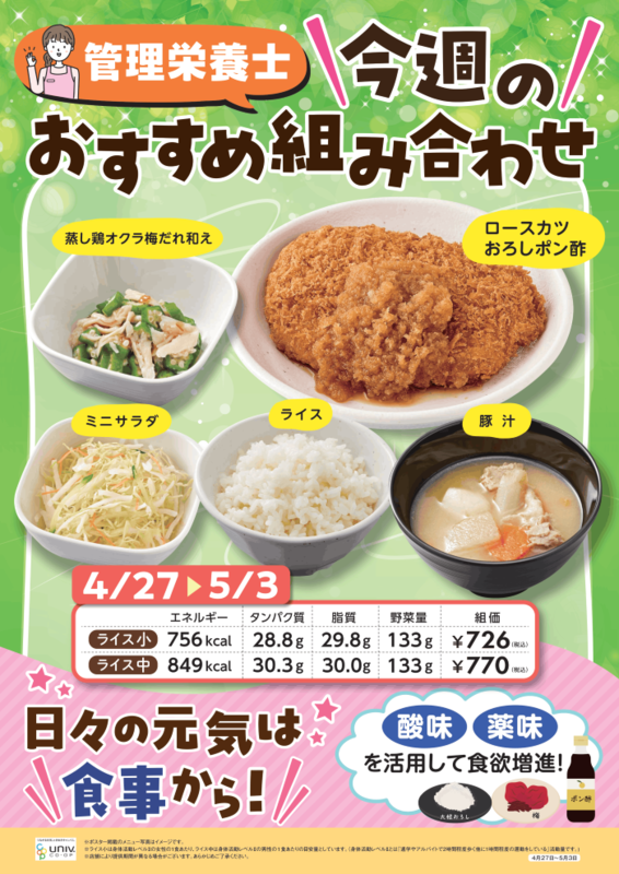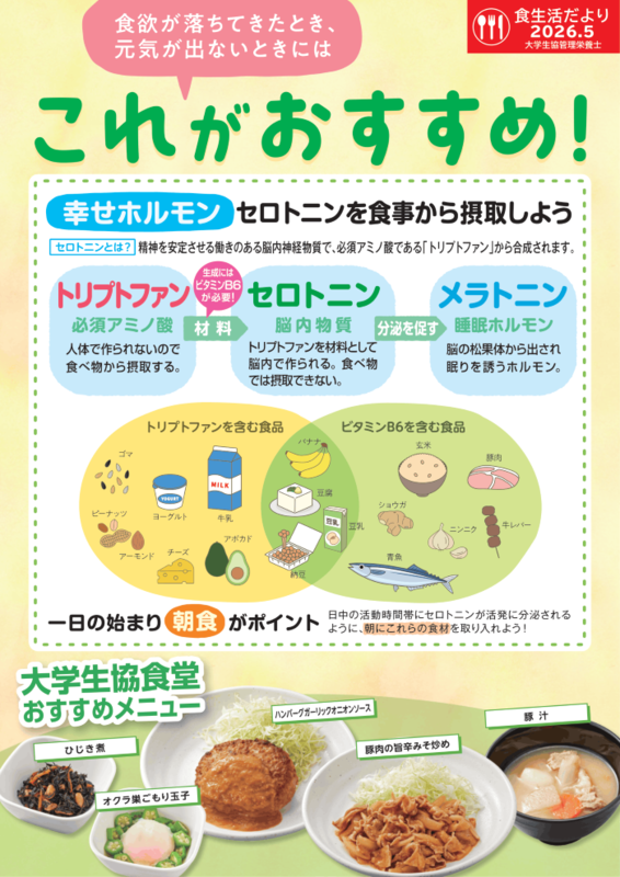 管理栄養士から~今週のおすすめ組合せ~【4/27~】 大学生協関西北陸地区所属の管理栄養士より、食堂メニューや健康のお便りをお知らせいたします。 関連情報 関連ファイル 管理栄養士食生活だより5月 戻る